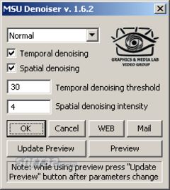 Free high-quality video denoising plugin for VirtualDub. Uses GPU for ultimate performance. Easy to use: there is fully automatic mode and several presets for different noise levels. Filter is designed for video quality improvement by noise removal, and video preprocessing for better compression or deinterlacing. Use of GPU mode allows faster then real time high definition video (HDTV) processing. The filter suppresses noise in both spatial and temporal domains.For each type of denoising different properties could be set in the propery box. With specific combinations, spatial-only or temporal-only denoising could be enabled. Similar Software