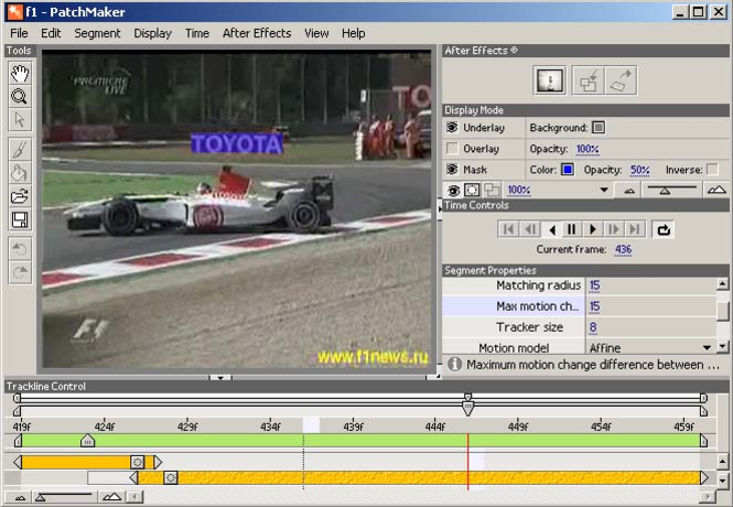 PatchMaker is a 2D motion tracking program designed for intraframe video editing and compositing. It can determine the motion of a selected object in the scene to a subpixel precision under a specified parametric motion model.The computed motion can be used to solve the following tasks: