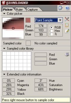 GAX is a powerful FREE application for web designers, graphic designers and everyone else who works with graphics. It contains a colorpicker, a screen ruler, and a screen capture tool. The colorpicker allows you to view the color value of every pixel on the screen in various formats(RGB, Hex or percents) and lets you sample that color. After you've sampled a color you can export it to Photoshop to use it in your creation, export it to the clipboard in various formats or save the colorlibrary as an .ACT file. The screen ruler is very handy for measuring objects on your screen. With the screen capture tool you can capture every part of the screen and export the image to Photoshop into a new image or a new layer. It's also possible to capture a sequence.