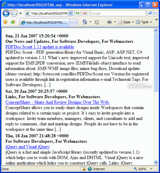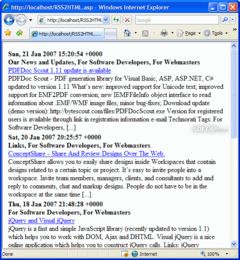 This free ASP script uses MSXML to load RSS feed from URL and display it. You can use it standalone or call from script on HTML page to generate HTML content from RSS feed and then display on your HTML page. Similar Software
