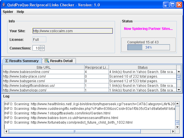 QuidProQuo automatically scans through your site to locate your link partners. It then spiders through your link partners sites to verify reciprocal links back to you. It will find the link cheaters (those to whom you are linking but are not returning the favor). With multi-threading it allows you to speed up the process by spidering multiple sites at the same time (the lite version has a maximum of 2 threads). The software checks links through the Yahoo search engine first to find the reciprocal links to accelerate the process. You can save your results to excel/csv format. In addition, the full version allows you to speed up the process further by spidering upto 16 sites simultaneously. Similar Software